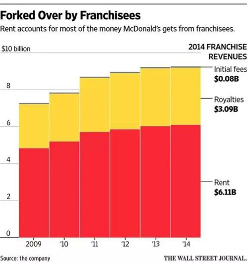 這是雷·克羅克在早期設(shè)計(jì)麥當(dāng)勞的特許經(jīng)營(yíng)模式時(shí),就留下的一個(gè)獨(dú)到之處:為了加強(qiáng)控制權(quán),所有門店所需要的土地物業(yè),都要由麥當(dāng)勞總部出面收購(gòu),再轉(zhuǎn)租給特許經(jīng)營(yíng)商,每年按略低于市場(chǎng)價(jià)的水平收購(gòu)租金。在房地產(chǎn)市場(chǎng)節(jié)節(jié)攀升時(shí),租金收入會(huì)水漲船高;而一旦特許經(jīng)營(yíng)商表現(xiàn)欠佳,也可以隨時(shí)將他們“掃地出門”。一些持有麥當(dāng)勞股票的對(duì)沖基金經(jīng)理們甚至曾經(jīng)想過,把麥當(dāng)勞的餐飲和房地產(chǎn)業(yè)務(wù)拆分成兩部分,以便更有效地管理資產(chǎn)。