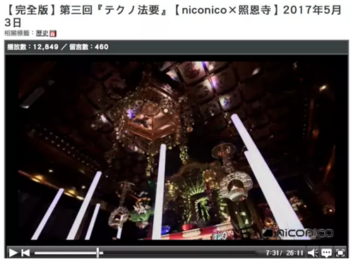 這是日本福井市照恩寺的一場超度儀式,跟以往莊嚴肅穆的宗教儀式相比,這場電音法會顯得極“不正經(jīng)”。除了用電子音樂誦經(jīng)、3D全息技術(shù)投影、五光十色的照明之外,這場法會還在日本彈幕網(wǎng)站鼻祖 niconico 上進行了直播,引來 1.9 萬人觀看。