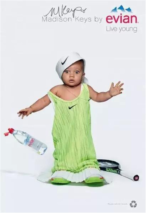 針對(duì)戶外、數(shù)字和社交網(wǎng)絡(luò)的創(chuàng)意則主要集中在一個(gè) Evian Young Team 的概念,一個(gè)由依云代言人莎拉波娃、Stan Wawrinka、Lucas Pouille、Madison Keys 以及高爾夫球員 Lydia Ko 等人組成的團(tuán)隊(duì)來拍攝廣告的主要視覺:喝了依云水之后,他們都換上一套 Oversize 的運(yùn)動(dòng)服,“變成了嬰兒”。
