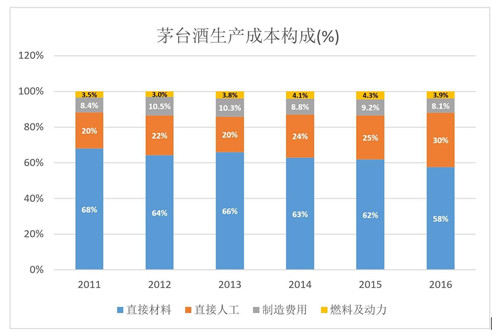 茅臺酒的生產(chǎn)成本包括原材料、人工、制造費(fèi)用、燃料及動力四個部分。2011-2016年,直接材料占比從68%降至58%,直接人工占比則由20%增至30%。