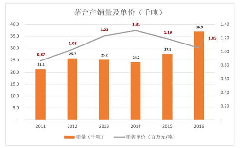 2016年,貴州茅臺產(chǎn)量、銷量創(chuàng)紀(jì)錄地達(dá)到5.99萬噸和3.69萬噸,單價(jià)則進(jìn)一步滑落到105萬元/噸。不是因?yàn)槊┡_降價(jià),而是產(chǎn)品結(jié)構(gòu)發(fā)行了變化。