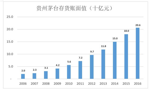 2005-2016年,貴州茅臺存貨賬面值年均復(fù)合增長率達(dá)24.4%,幾乎是產(chǎn)能擴(kuò)張速度的一倍。