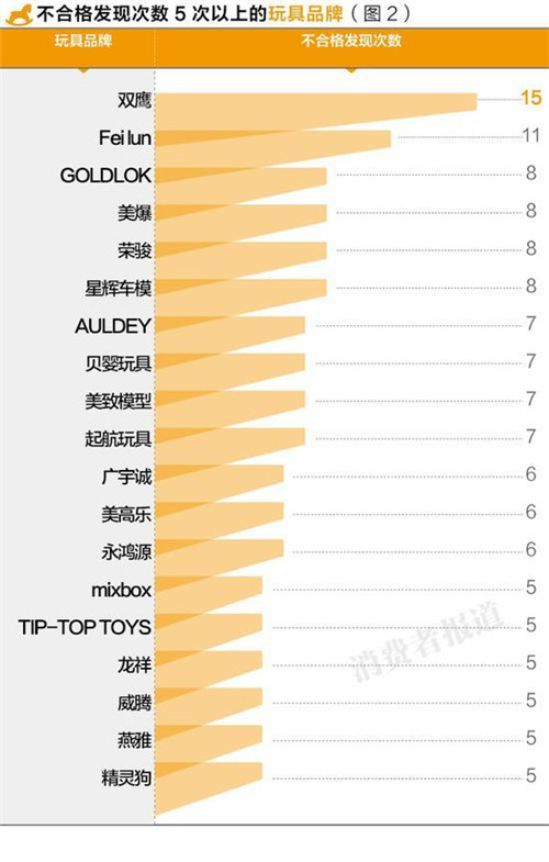 雙鷹與飛輪的不合格次數(shù)超過10次,而美高樂、星輝車模等較知名品牌也數(shù)次登上黑榜。兒童玩具的抽檢不合格項(xiàng)目主要集中在標(biāo)志與危險(xiǎn)警示不規(guī)范、以及小零件、尖端傷害等方面。