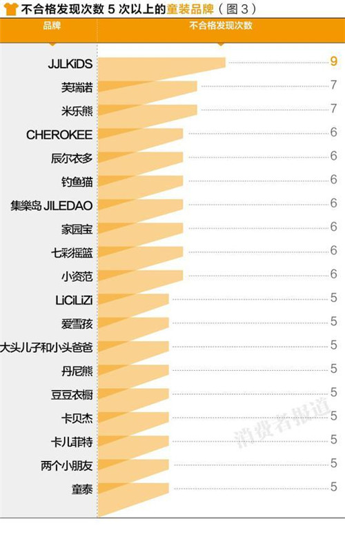 數(shù)據(jù)分析顯示,由郭濤父子代言的有30年創(chuàng)立歷史的季季樂(JJLKIDS)童裝的不合格發(fā)現(xiàn)次數(shù)竟高達(dá)9次。而兒童與嬰幼兒服飾的不合格項(xiàng)目集中在標(biāo)識、纖維含量、pH值、使用說明等方面。