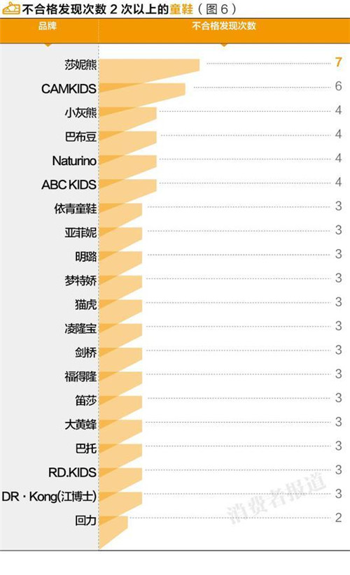 抽檢數(shù)據(jù)顯示,上海童鞋品牌莎妮熊的的不合格次數(shù)最高,而童鞋抽檢不合格的,回力也有兩次出現(xiàn)不合格。主要問題集中在強(qiáng)度硬度、標(biāo)識、感官質(zhì)量、高度(長度)誤差等方面。