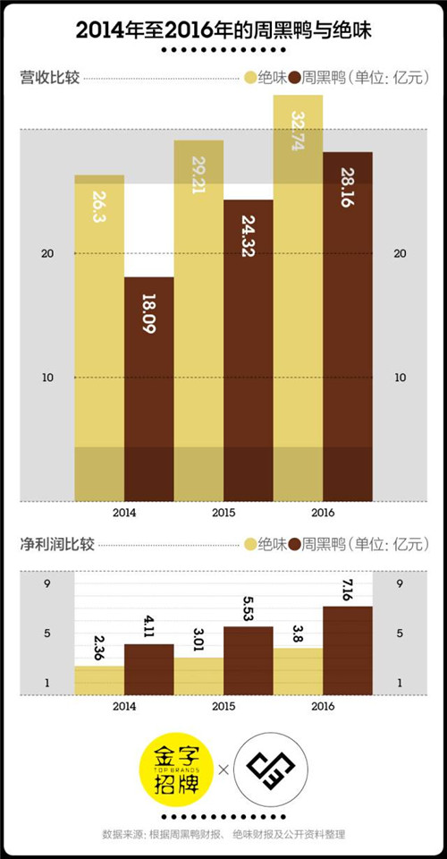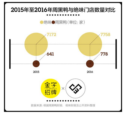 近兩年的市場表現(xiàn)沒有讓潘攀失望。根據(jù)咨詢公司弗諾斯特沙利文的數(shù)據(jù),中國休閑鹵制品零售總額從2010年的232億元增長至2016年的637億元,年均復合增長率為18.5%。截至2016年12月31日,周黑鴨全年營收約為28.16億元,較去年同期的24.32億元增長15.8%。雖然778家的門店數(shù)量只有絕味的1/10左右,但周黑鴨的利潤率是絕味的2倍多。