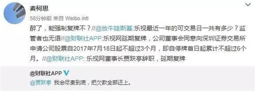 另外,關(guān)于樂視網(wǎng)股票復(fù)牌的事情,公告也一并做了回復(fù):公司董事會同意向深圳證券交易所申請公司股票自2017年7月18日起不超過3個月,即自停牌首日起累計不超過6個月。