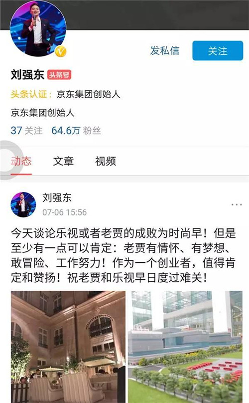 京東集團創(chuàng)始人劉強東在個人認(rèn)證頭條號對樂視表示聲援,劉強東稱:今天談?wù)摌芬暬蛘呃腺Z的成敗為時尚早!但是至少有一點可以肯定:老賈有情懷、有夢想、敢冒險、工作努力!作為一個創(chuàng)業(yè)者,值得肯定和贊揚!祝老賈和樂視早日渡過難關(guān)!