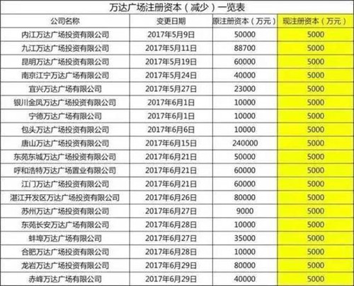 2017年5月9日至6月29日,全國19家萬達商業(yè)項目公司——各地的萬達廣場投資公司集中進行了減資,注冊資本金由原先最高24億元,最低9000萬元,統(tǒng)一減至5000萬元。