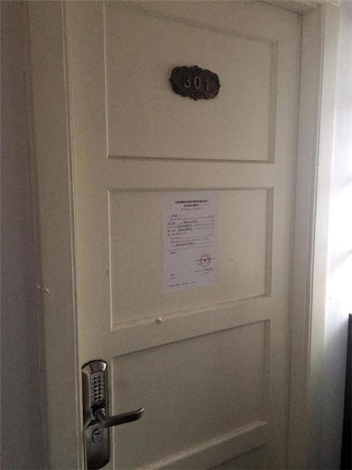 長(zhǎng)樂(lè)路764弄19號(hào)樓3樓,裝著密碼門的就是這間民宿。2樓業(yè)主反復(fù)投訴后,城管部門上門檢查時(shí)發(fā)現(xiàn)民宿侵占了一部分過(guò)道的空間,故城管向業(yè)主下發(fā)了責(zé)令改正通知書。圖中貼于門上的,即是城管下發(fā)的通知書。