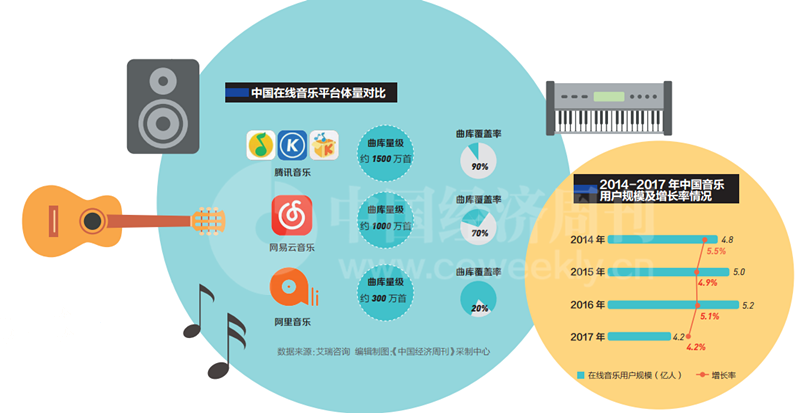 2016年7月,QQ音樂與酷我音樂、酷狗音樂并入騰訊音樂旗下后,騰訊開始對(duì)數(shù)字音樂版權(quán)著重布局。2017年3月和5月,騰訊音樂先后拿下中國(guó)大陸地區(qū)對(duì)環(huán)球音樂所擁有的音樂詞曲獨(dú)代權(quán)和數(shù)字版權(quán)分銷權(quán),并為此付出了3.5億美元現(xiàn)金及購(gòu)買環(huán)球音樂1億美元期權(quán)的代價(jià)。“截至目前,全球范圍內(nèi)有200多家唱片公司持有數(shù)字音樂的版權(quán),目前90%以上都已經(jīng)被騰訊拿下?!币晃痪W(wǎng)易云音樂內(nèi)部人士告訴《中國(guó)經(jīng)濟(jì)周刊》記者,騰訊音樂目前擁有的版權(quán)數(shù)量、廣度和對(duì)版權(quán)的投入都是業(yè)內(nèi)第一,其中不少是“獨(dú)家代理權(quán)”,相當(dāng)于緊緊地扎起了一個(gè)籬笆。