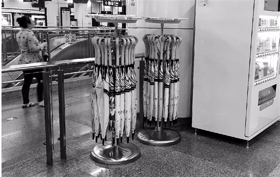 昨天,錢(qián)報(bào)記者來(lái)到地鐵武林廣場(chǎng)站,在地鐵刷卡入口處附近,就發(fā)現(xiàn)了兩個(gè)圓柱形的架子。架子上掛滿(mǎn)了各式各樣的長(zhǎng)柄雨傘。架子上貼著提示語(yǔ):掃碼借傘。