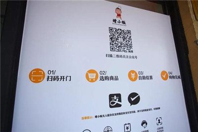 在無人超市的玻璃門上有二維碼,用微信掃描后會提示關注無人超市公司的二維碼,關注后下面有“我要開門”的應用,點擊獲得一把“鑰匙”就可以開門。