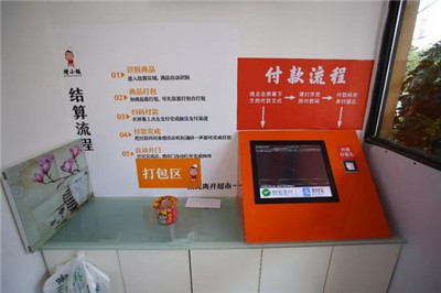 將商品放置在打包臺,有打包袋可以自行取用,旁邊的電腦上也就顯示了所購商品的數(shù)量和價格,選擇微信或是支付寶結(jié)算,調(diào)出付款碼,在電腦旁掃碼裝置上掃描就可以完成結(jié)賬,這時候,超市出去的大門就打開了。