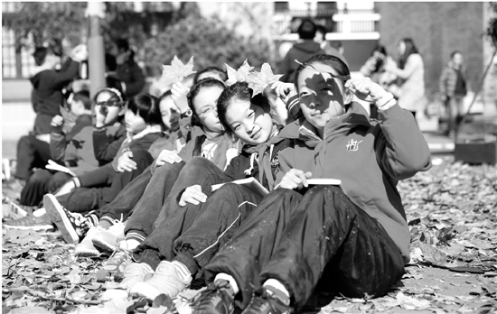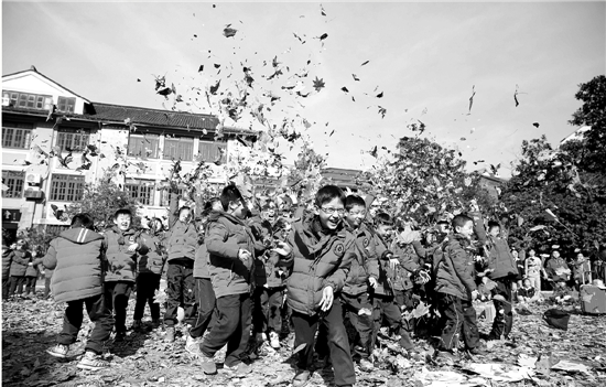 中午,當(dāng)錢報記者趕到學(xué)校時,被眼前的景象驚到了:150米的環(huán)形操場中間,鋪滿了金黃色的落葉,一群學(xué)生正把落葉滿滿地捧起,再高高地往上一拋,于是只見滿眼的落葉紛飛……