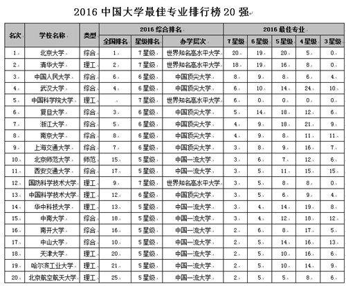 報(bào)告顯示,北京大學(xué)20個(gè)專業(yè)榮膺中國七星級專業(yè),居2016中國大學(xué)最佳專業(yè)排行榜榜首;清華大學(xué)第2,中國人民大學(xué)第3,武漢大學(xué)第4,中國科學(xué)院大學(xué)第5。