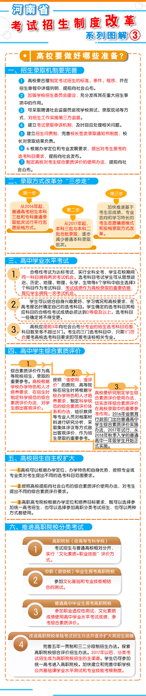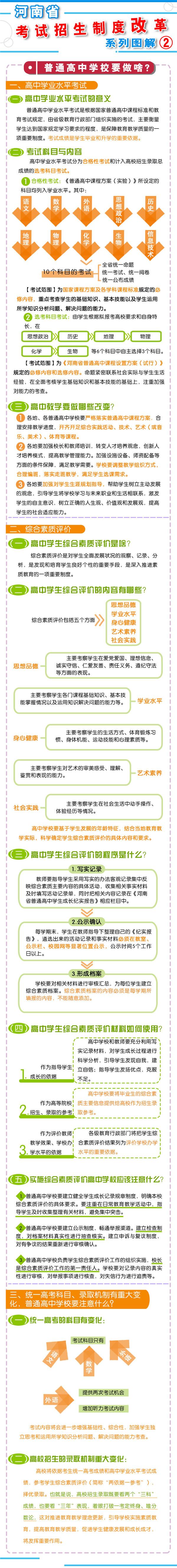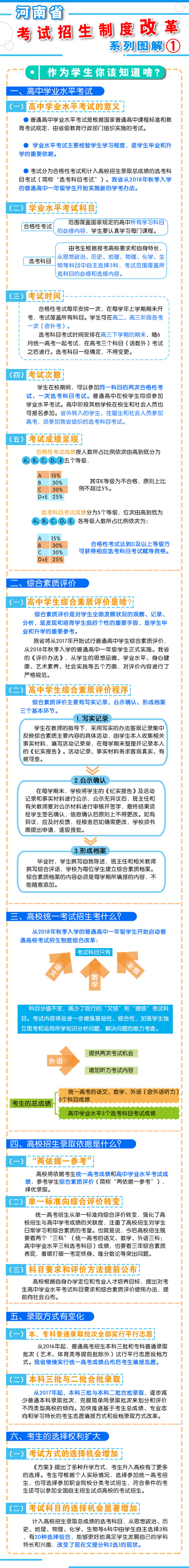 8月23日上午9時,河南省教育廳召開新聞通氣會,通報了《河南省深化考試招生制度改革實施方案》(以下簡稱《方案》)的有關(guān)情況?! “凑铡斗桨浮芬?,我省從2018年秋季入學的普通高中一年級學生開始啟動高考綜合改革,考生總成績由統(tǒng)一高考的語、數(shù)、外3科成績和高中學業(yè)水平3個選考科目成績組成。招生錄取實行基于統(tǒng)一高考成績和高中學業(yè)水平考試成績、參考學生綜合素質(zhì)評價擇優(yōu)錄取機制?! ?strong>總體目標  到2020年,初步形成分類考試、綜合評價、多元錄取的考試招生模式,進一步健全促進公平、科學選才、監(jiān)督有力的體制機制,構(gòu)建順應時代要求、符合教育規(guī)律和河南省情的考試招生制度。  主要任務(wù)  一、促進升學機會公平  逐步增加我省考生接受優(yōu)質(zhì)高等教育的機會,逐步增加農(nóng)村學生升入重點高校人數(shù),減少和規(guī)范高考加分,完善中小學招生辦法?! ?strong>二、改革考試形式和內(nèi)容  完善高中學業(yè)水平考試??荚嚪譃楹细裥钥荚嚭陀嬋敫咝U猩浫】偝煽兊倪x考科目考試(簡稱“選考科目考試”)。合格性考試范圍覆蓋國家規(guī)定的高中所有學習科目的必修內(nèi)容。選考科目由考生根據(jù)報考高校要求和自身特長,從思想政治、歷史、地理、物理、化學、生物等科目中自主選擇3科。學生在校期間,可以參加同一科目的兩次合格性考試、一次選考科目考試?! ∵M一步規(guī)范高中學生綜合素質(zhì)評價。建立全省規(guī)范統(tǒng)一的高中學生綜合素質(zhì)檔案,完善學生綜合素質(zhì)評價電子化管理平臺,客觀記錄學生成長過程中的真實表現(xiàn),確保程序嚴格、公開透明、內(nèi)容真實可信?! ⊥七M高職院校分類考試。高職院校(含高等??茖W校)考試招生與普通高校相對分開,實行“文化素質(zhì)+職業(yè)技能”評價方式。中職(含技校)畢業(yè)生報考高職院校,參加文化基礎(chǔ)和專業(yè)技能相結(jié)合的測試。普通高中畢業(yè)生報考高職院校,參加職業(yè)適應性測試,文化素質(zhì)成績使用高中學業(yè)水平考試成績,參考綜合素質(zhì)評價?! ∩罨荚噧?nèi)容改革。依據(jù)國家高中課程標準和高校人才選拔、培養(yǎng)要求,科學設(shè)計命題內(nèi)容,增強基礎(chǔ)性、綜合性,突出能力、創(chuàng)新導向,著重考察學生獨立思考和運用所學知識分析問題、解決問題的能力?! ?strong>三、改革招生錄取機制  完善招生選拔機制。高校要合理確定考試招生的標準、條件、程序等內(nèi)容,在招生章程中詳細列明并提前向社會公布。要加強學校招生委員會建設(shè),充分發(fā)揮其在重大招生事項中的作用。建立考試錄取申訴機制和招生問責制,校長對錄取結(jié)果負責。  改革錄取方式。從2017年起,本科三批與本科二批合批錄取,逐步減少普通本科錄取批次,克服簡單用錄取批次來劃分和評價不同類型高校的傾向。加快推進基于考生總成績、專業(yè)志向和學習特長的考生志愿填報方式和投檔錄取方式改革。  四、改革監(jiān)督管理機制  加強信息公開,全面實施高校招生“陽光工程”,進一步擴大信息公開的范圍和內(nèi)容。強化考試安全,堅持從嚴治考,完善考試招生誠信制度,落實誠信結(jié)果使用要求。加大違規(guī)查處力度,加強考試招生全程監(jiān)管,嚴厲打擊和嚴肅查處考試招生中的違法違規(guī)行為,及時公布查處結(jié)果,嚴格責任追究?! ?strong>五、2018年秋季開始實施  從2018年秋季入學的普通高中一年級學生開始啟動普通高??荚囌猩贫染C合改革?! ≡诟母锟荚嚳颇吭O(shè)置上,不分文理科,外語科目提供兩次考試機會??忌目偝煽冇山y(tǒng)一高考的語文、數(shù)學、外語(含外語聽力)3個科目成績和高中學業(yè)水平3個選考科目考試成績組成。保持統(tǒng)一高考的語文、數(shù)學、外語分值不變。  在改革招生錄取機制上,推進基于統(tǒng)一高考成績和高中學業(yè)水平考試成績、參考學生綜合素質(zhì)評價的多元錄取機制改革。高校要根據(jù)自身辦學定位和專業(yè)人才培養(yǎng)目標,提出對考生高中學業(yè)水平考試科目要求和綜合素質(zhì)評價使用辦法,提前向社會公布?! ?016年省教育行政部門出臺普通高中學業(yè)水平考試實施辦法和普通高中學生綜合素質(zhì)評價實施辦法,從2018年秋季入學的普通高中一年級學生開始正式實施。  省教育廳文件通知:  1、關(guān)于印發(fā)《河南省普通高中學業(yè)水平考試實施辦法(試行)》的通知  2、關(guān)于印發(fā)《河南省普通高中學生綜合素質(zhì)評價實施辦法(試行)》的通知  我省深化考試招生制度改革實施方案圖解: