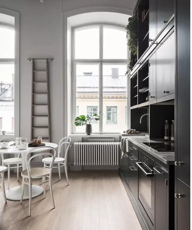 整個公寓的特點在于它足夠的層高,黑色廚房是空間的重心,同時也讓空間顯得更加優(yōu)雅簡約。木色、金屬色以及植物盆栽是點綴這塊最好的裝飾。足夠的存儲空間,也許對于實用方面或許不夠便捷,然而木質(zhì)樓梯是很好的解決辦法。