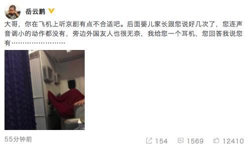 3月7日晚,岳云鵬通過微博譴責(zé)飛機(jī)上不文明現(xiàn)象,寫道:“大哥,你在飛機(jī)上聽京劇有點(diǎn)不合適吧。后面嬰兒家長(zhǎng)跟您說好幾次了,您連聲音調(diào)小的動(dòng)作都沒有,旁邊外國友人也很無奈,我給您一個(gè)耳機(jī),您回答我說您有……”
