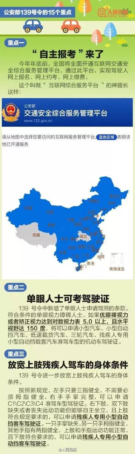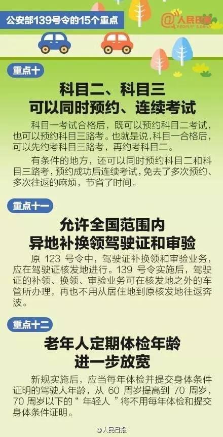4月1日起,公安部《機動車駕駛證申領和使用規(guī)定》將正式實施。今后,駕駛人考試可以網(wǎng)上自主預約,駕駛證在全國可以異地年審,每年提交駕駛證身體條件證明的年齡由60周歲改為70周歲……