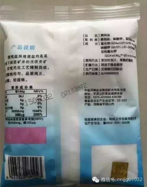真鹽包裝袋上的噴碼不會重號,假袋子的噴碼都是事先印好的,都一樣,類似假幣的“連號”。