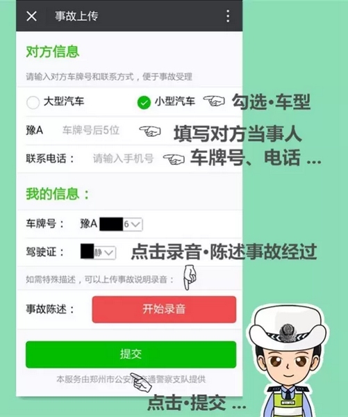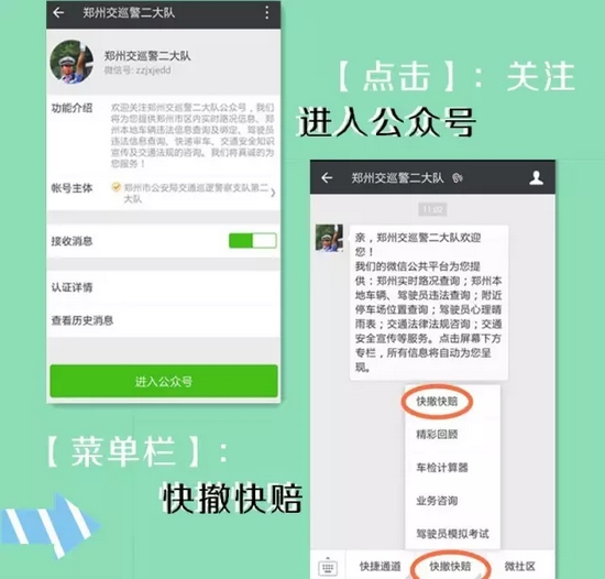 支隊(duì)科研所此次研發(fā)的交通事故快賠快撤功能,跳出了以往單方損失2000元以下的限制,只要在交警二大隊(duì)轄區(qū):嵩山路(含)嵩山路以西區(qū)域及中原區(qū)、西開發(fā)區(qū)全境,公共道路上發(fā)生的兩車事故,車輛能夠正常駕駛,沒有人員受傷,就可以通過(guò)“鄭州交巡警二大隊(duì)微信公共平臺(tái)”進(jìn)行快撤快賠處理。