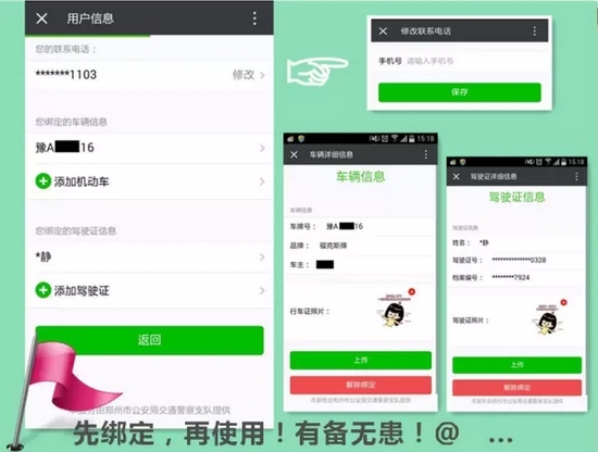 分別填寫:聯(lián)系電話、綁定車輛信息、綁定駕駛證信息確認(rèn)無(wú)誤后按確定保存。