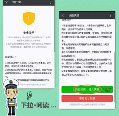 4、適用范圍:交警二大隊(duì)轄區(qū)內(nèi)嵩山路(含)嵩山路以西區(qū)域及中原區(qū)、西開發(fā)區(qū)全境,公共道路上發(fā)生的兩車事故,車輛能夠正常駕駛,沒有人員受傷,均適用。