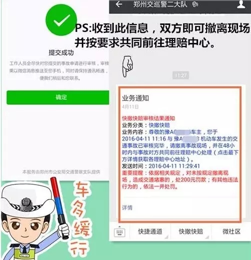 該功能上線后,親們,再也不用站路邊“說(shuō)個(gè)舌尖帶火,嗓子冒煙”了,只需拍幾張現(xiàn)場(chǎng),照片發(fā)個(gè)微信就可以馬上閃人、撤離事故現(xiàn)場(chǎng)!既不造成交通擁堵又安全省力。
