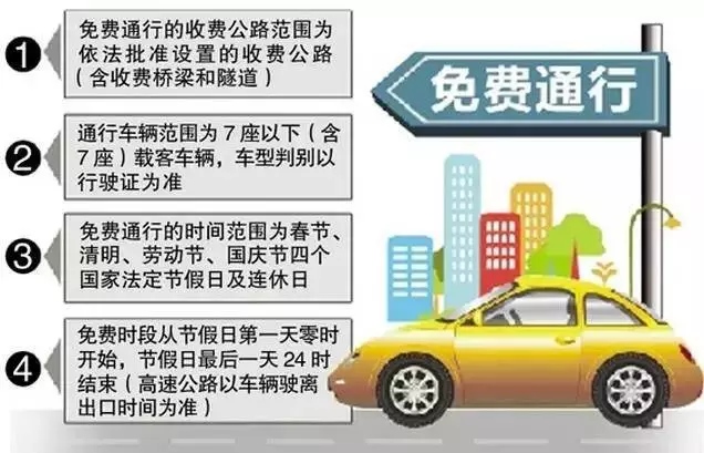 根據(jù)《重大節(jié)假日免收小型客車通行費實施方案》,高速公路免費通行的的具體政策如下:(一)免費通行的時間范圍為春節(jié)、清明節(jié)、勞動節(jié)、國慶節(jié)等四個國家法定節(jié)假日,以及當(dāng)年國務(wù)院辦公廳文件確定的上述法定節(jié)假日連休日。免費時段從節(jié)假日第一天00:00開始,節(jié)假日最后一天24:00結(jié)束(普通公路以車輛通過收費站收費車道的時間為準(zhǔn),高速公路以車輛駛離出口收費車道的時間為準(zhǔn))。