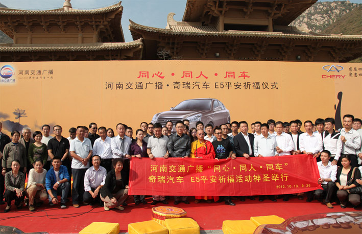 公元2012年10月13日(農(nóng)歷八月二十八)9:36正點時刻,河南交通廣播“同心?同人?同車—奇瑞汽車 E5平安”祈?;顒由袷ヅe行。河南交通廣播為了讓本次祈福活動氣氛更好,在更大范圍內(nèi)傳播、弘揚禪宗之精神。特把本次活動的主要儀式設(shè)置禪文化氛圍濃郁的“禪宗少林·音樂大典”內(nèi)神圣舉行。