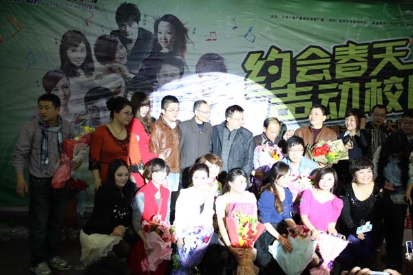 在兩個(gè)小時(shí)的活動(dòng)時(shí)間里,河南電臺(tái)信息廣播《真情故事》節(jié)目主持人楊城、佳音,《文聰時(shí)間》節(jié)目主持人文聰,《有愛(ài)向前沖》節(jié)目主持人丁丁、《今夜情歸航》節(jié)目主持人牧歌等人紛紛登臺(tái),以歌曲、小品等形式展示主持人的個(gè)性與風(fēng)采,并與學(xué)生互動(dòng)游戲,以此來(lái)回報(bào)聽(tīng)眾多年來(lái)的堅(jiān)守與厚愛(ài)。他們帶來(lái)的小品《相親》、《超幸福鞋墊兒》、真情故事《你能背我上樓嗎》及《有愛(ài)向前沖》和《文聰時(shí)間》節(jié)目,邀請(qǐng)場(chǎng)下的學(xué)生現(xiàn)場(chǎng)互動(dòng),使整個(gè)活動(dòng)高潮迭起,精彩紛呈。在演出期間,信息廣播還為楊雪、張一迪、王衛(wèi)衛(wèi)等10名大學(xué)生頒發(fā)了聘書(shū),聘請(qǐng)他們擔(dān)任聽(tīng)評(píng)員。曾經(jīng)榮獲央視“原創(chuàng)中國(guó)”歌壇十大新人稱(chēng)號(hào)的我省著名本土男歌手余潤(rùn)澤,也來(lái)到了活動(dòng)現(xiàn)場(chǎng),他的一曲《愛(ài)我就不要離開(kāi)我》引爆了全場(chǎng),為見(jiàn)面會(huì)演出圓滿(mǎn)收尾。