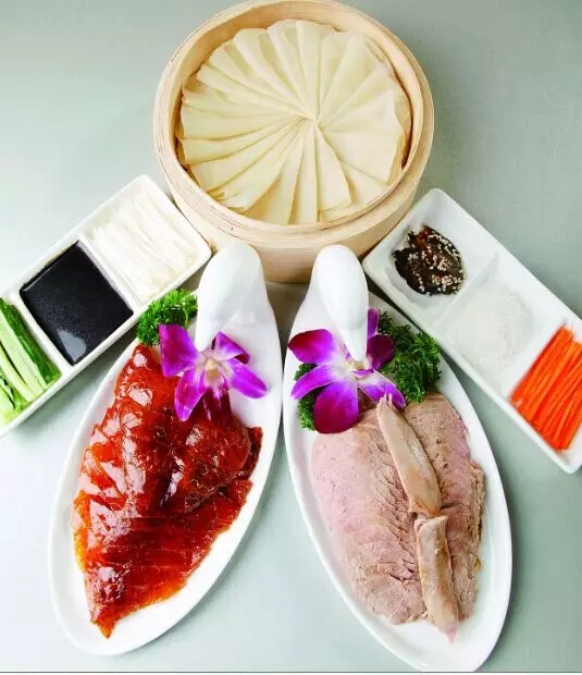 烤鴨號(hào)稱天下第一名吃,汴京果木烤鴨色澤紅潤(rùn),低脂少油,鴨皮酥松脆嫩而不膩。