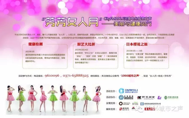 2、微信報名:關注微信公眾賬號“1066城市之聲”,發(fā)送“女人月+姓名+手機號”