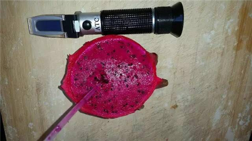 ▼魯山金田地火龍果園區(qū)現(xiàn)場采摘甜度測試