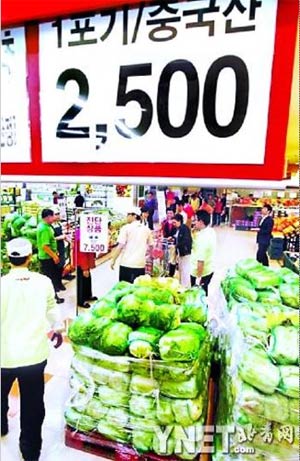 進入10月以來,作為韓國的“國菜”泡菜用的原料大白菜價格出現(xiàn)了暴漲的情況。在首爾,超市里一棵白菜的價格一度達到了1.5萬韓元(約合人民幣89元)。為了平抑菜價,韓國政府緊急從中國進口免關稅的大白菜救急。記者昨日在韓國首爾的樂天連鎖超市了解到,在每人限購3棵的情況下,中國大白菜在開業(yè)后30分鐘左右就已售罄,超市已決定從中國追加進口10萬棵白菜。