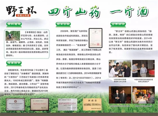 通過多方溝通尋訪,于2009年開始與多家大專院校合作共同研發(fā)鐵棍山藥酒,研發(fā)過程也是歷經(jīng)了不少的艱辛坎坷,歷時(shí)5年,終于成功。于2014年獲得了國家專利,并于2014年成立了野王懷氏生物科技有限公司,鐵棍山藥酒通過低溫發(fā)酵釀造成酒,不僅能將山藥中的營養(yǎng)成份悉數(shù)保留,藥借酒力,酒攜藥功,更是使人體吸收率大幅提高,賦予了懷鐵棍山藥更高的價(jià)值。同時(shí),與當(dāng)?shù)厣剿幏N植戶和合作社簽訂常年收購合同,穩(wěn)定了山藥的市場價(jià)格,也帶領(lǐng)著大家一起致富奔小康。