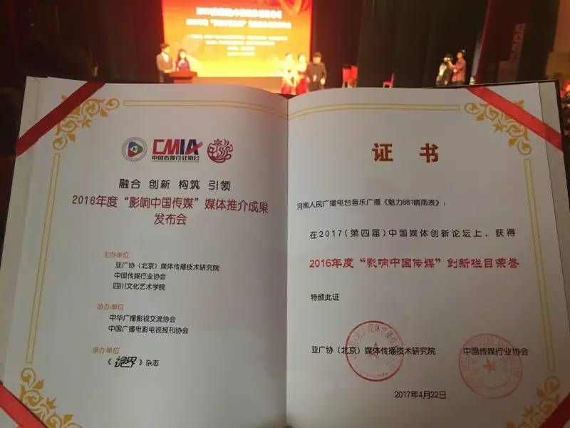 我們魅力881河南音樂廣播獲得2016年度”影響中國傳媒“最具創(chuàng)新力媒體獎,《魅力881晴雨表》獲得2016年度“影響中國傳媒”創(chuàng)新欄目獎,DJ 陽陽出席論壇及典禮,與來自全國的媒體同仁進(jìn)行交流,分享廣播影視產(chǎn)業(yè)的寶貴經(jīng)驗。