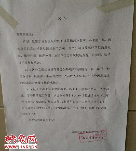 不過(guò),發(fā)稿前,“大象幫辦”記者接到了該小區(qū)物業(yè)的最新消息:為消除業(yè)主的顧慮,他們已在小區(qū)單元門口張貼公告,向業(yè)主解釋了外立面凸起產(chǎn)生原因,并承諾承建單位工程部將組織維修人員在3月20日之前進(jìn)場(chǎng)維修,直至此類問(wèn)題維修完畢。