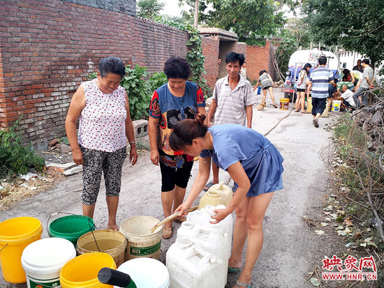 平頂山市寶豐縣李莊鄉(xiāng)馬疙瘩村,村民們帶著大小不一的儲(chǔ)水容器在當(dāng)?shù)厮块T布設(shè)的水罐旁有序取水。