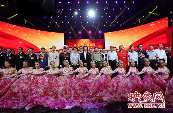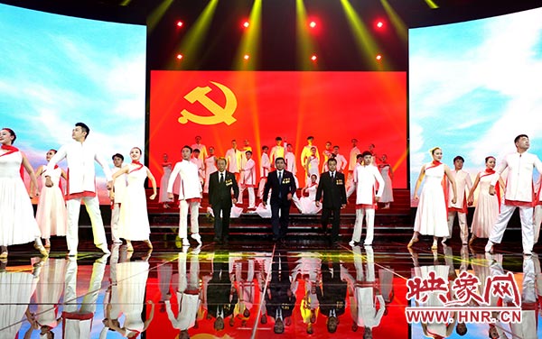 在全體人員共同高歌《沒有共產黨就沒有新中國》中,文藝匯演落下帷幕。演出結束后,省領導趙素萍、胡永生、段喜中、戴柏華、靳克文和省總工會黨組書記、常務副主席李建莊走上舞臺,祝賀演出成功,接見全體演職人員,并與大家合影留念。