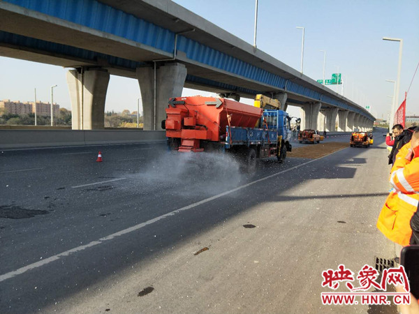快速路的除雪保潔工作,趙勇總結(jié)為“一融、二鏟、三輥掃、四清運(yùn)”。一融:氣溫在0度以下撒融雪劑。因為溫度低橋上路面會結(jié)冰,在橋上部分少量食用融雪劑,目的達(dá)到不結(jié)冰。二鏟:將不結(jié)冰的雪鏟到兩側(cè)。三輥掃:雪鏟滾刷清掃積雪。四清運(yùn):人機(jī)配合全面清除殘存冰雪。