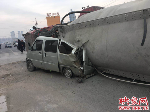 22日上午9時30分左右,江山路與新苑路交叉口東北角,車牌號為豫EX115掛的槽罐車仍然壓在車牌號豫AA817Y的面包車上。槽罐車上裝有40多噸散裝水泥,另一輛趕來救援的槽罐車正在將事故車內(nèi)的水泥轉(zhuǎn)移出來。救援的槽罐車司機(jī)說,事故發(fā)生時,槽罐車沿江山路由南向北行駛,走到與新苑路交叉口時,面包車沿江山路由北向東左拐。事故路口沒有紅綠燈,大車司機(jī)看到面包車后,立即向右打方向,躲避面包車。由于離心力作用,大車向左側(cè)翻,壓在面包車上,將面包車四分之三壓扁,僅剩駕駛室位置。