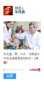 映象網(wǎng)汝州訊(記者 楊增強)河南仁醫(yī),感動中國!映象網(wǎng)記者12月26日獲悉,“感動中國”2017年度候選人物已經(jīng)投票已經(jīng)開始,由河南省委宣傳部選報的我省候選人汝州市金庚康復(fù)醫(yī)院院長宋兆普入圍,網(wǎng)友可關(guān)注央視網(wǎng)投票頁面(點擊下圖)為這位河南仁醫(yī)進行投票。