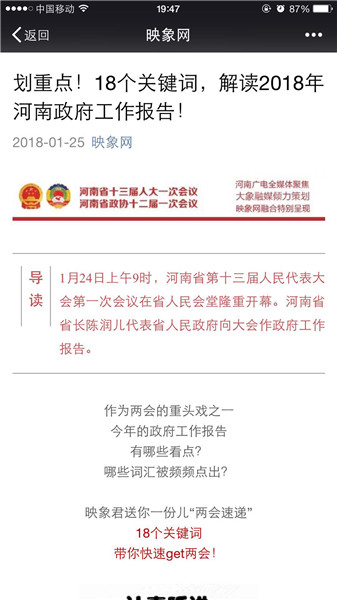 映象網(wǎng)官方微信策劃推出原創(chuàng)策劃《河南人,2018給你穩(wěn)穩(wěn)的幸福!》、《你好,我是河南!這是我的五年成績單,請接收!》、《2018年,河南都有哪些“小目標(biāo)”?》、《劃重點(diǎn)!18個(gè)關(guān)鍵詞,解讀2018年河南政府工作報(bào)告!》。每篇都刷屏朋友圈,網(wǎng)友積極轉(zhuǎn)發(fā)點(diǎn)贊,稱“看完真的覺著穩(wěn)穩(wěn)的幸福”。