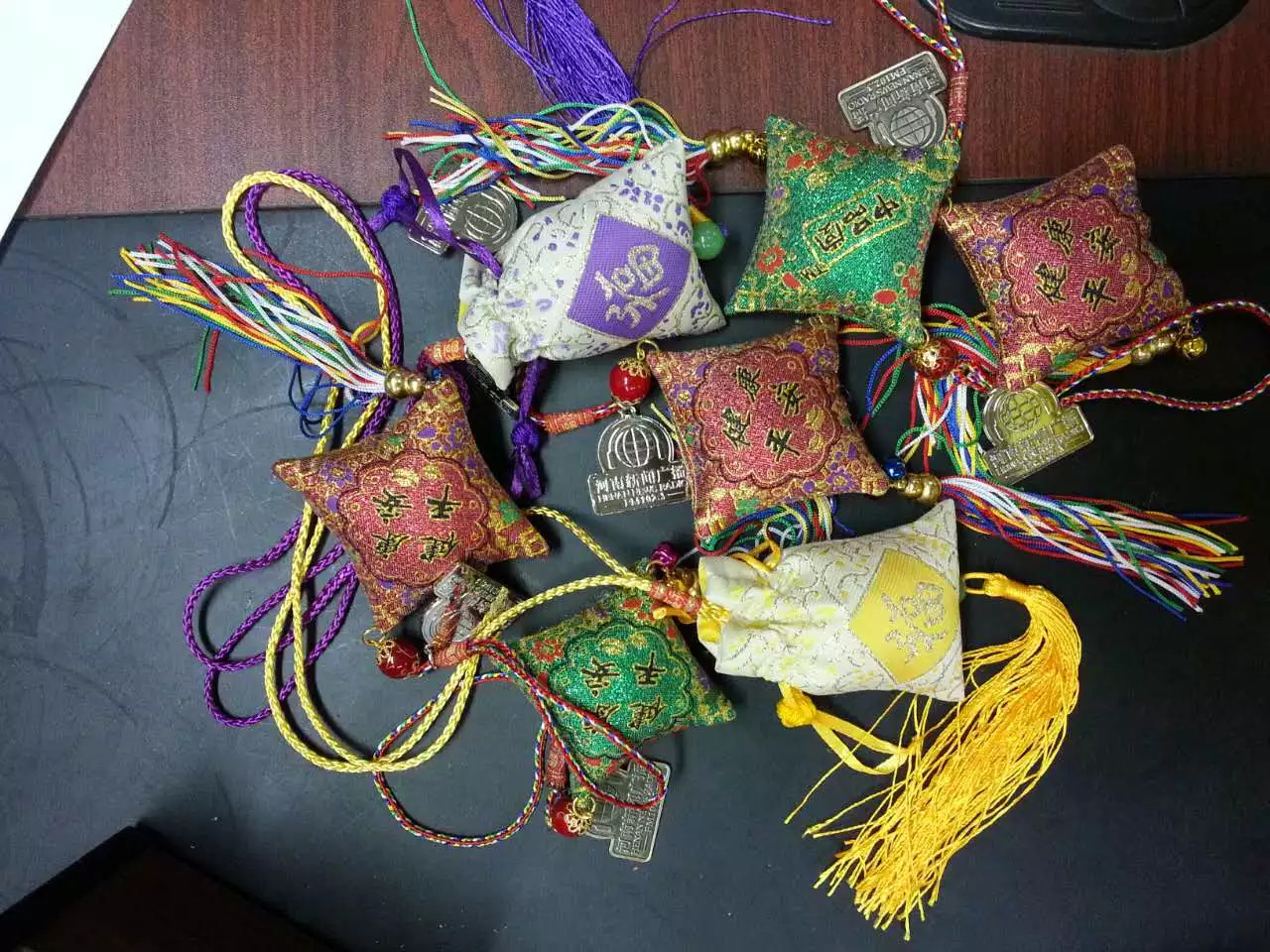 端午節(jié)佩香囊,不但有避邪驅(qū)瘟之意,而且有襟頭點(diǎn)綴之風(fēng)。香囊內(nèi)有朱砂、雄黃、香藥,外包以絲布,清香四溢,再以五色絲線弦扣成索,作各種不同形狀,結(jié)成一串。