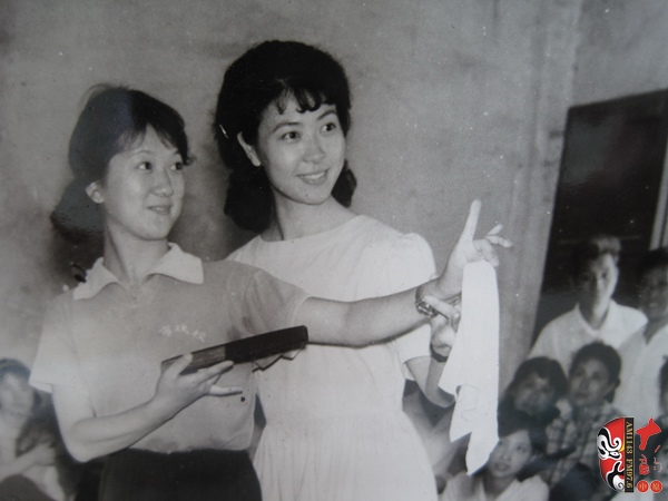 著名京劇演員沈建瑾(右)在給武慧敏(左)比戲
