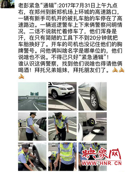 近日,在鄭州的朋友圈里轉(zhuǎn)發(fā)著一個(gè)“緊急通緝”的“尋人啟事”:2017年7月31日上午9點(diǎn)左右,在鄭州到新鄭機(jī)場(chǎng)上繞城的高速路口一輛有新手司機(jī)開(kāi)的被扎車(chē)胎的車(chē)停在路邊。一輛巡邏警車(chē)上下來(lái)倆警察問(wèn)明情況,二話(huà)不說(shuō)幫忙修車(chē),他們渾身是汗,在只有簡(jiǎn)陋的工具情況下不到20分鐘就把車(chē)胎換好了。開(kāi)車(chē)的司機(jī)也沒(méi)記住他們的胸牌警號(hào),問(wèn)他倆叫啥名字是哪單位的,他們說(shuō)啥也不說(shuō),不得已只好“緊急通緝”。