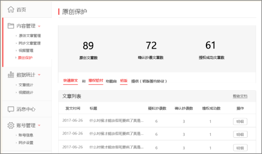 一點(diǎn)號(hào)、鳳凰號(hào)為自媒體用戶(hù)提供原創(chuàng)文章版權(quán)保護(hù)功能。 其中,鳳凰號(hào)將于月末開(kāi)啟維權(quán)賠付功能,通過(guò)后臺(tái)監(jiān)測(cè)200+主流平臺(tái),對(duì)侵權(quán)抄襲行為一查到底替作者維權(quán)。未來(lái)一點(diǎn)號(hào)、鳳凰號(hào)將會(huì)全力打造原創(chuàng)優(yōu)質(zhì)內(nèi)容的版權(quán)保護(hù)平臺(tái)及監(jiān)測(cè)網(wǎng)絡(luò),對(duì)于站內(nèi)文章被站外的抄襲也會(huì)進(jìn)行相關(guān)維權(quán)工作。