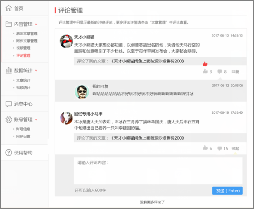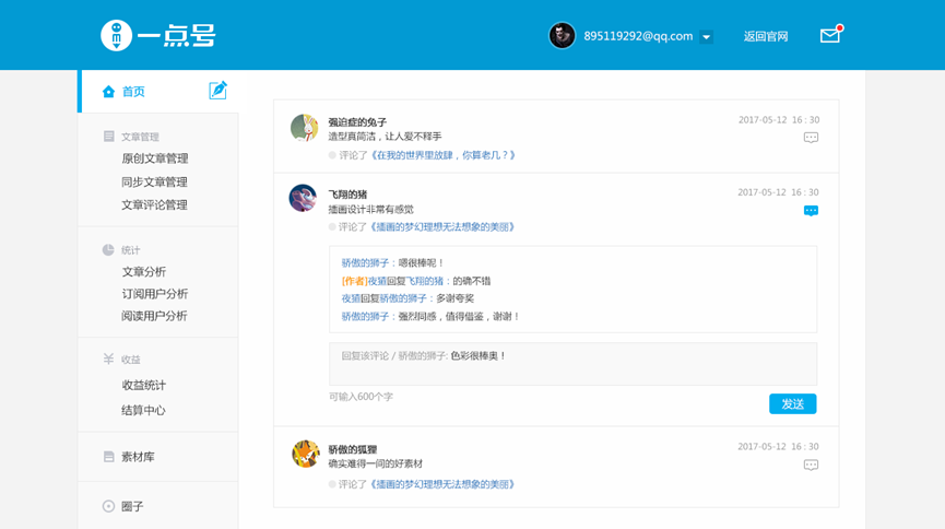 本次積分系統(tǒng)升級(jí)之后,一點(diǎn)號(hào)、鳳凰號(hào)的作者將會(huì)更方便快捷的在后臺(tái)查看用戶(hù)評(píng)論,參與用戶(hù)討論回復(fù),點(diǎn)贊自己欣賞的讀者評(píng)論,能夠更全面更多元化的與讀者進(jìn)行互動(dòng)。